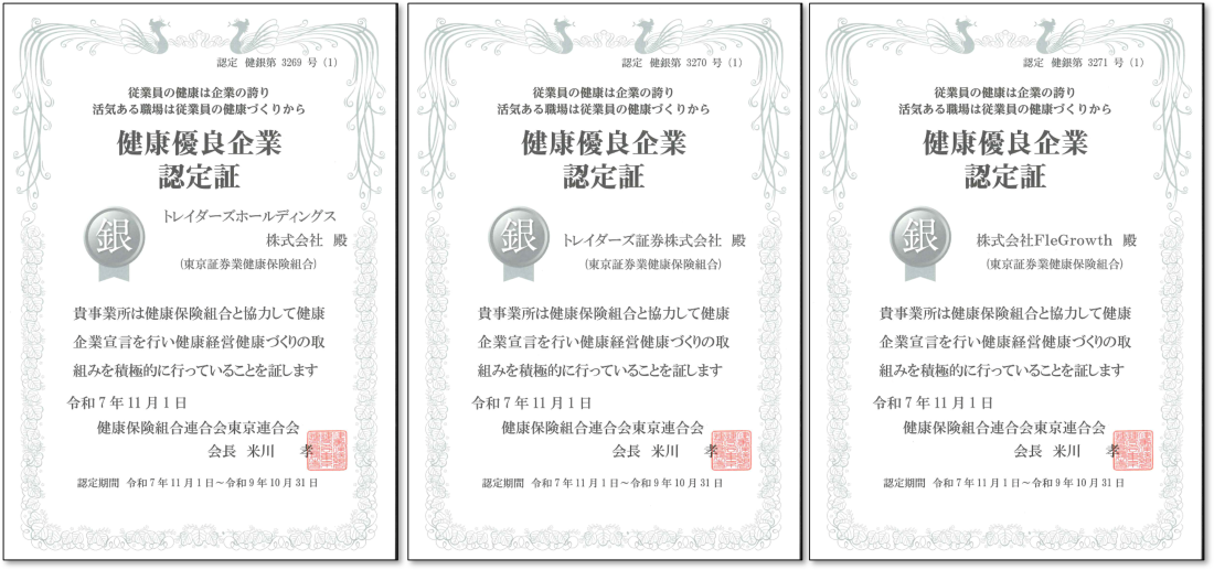 トレイダーズホールディングス、トレイダーズ証券、FleGrowth:健康優良企業「銀の認定」を更新