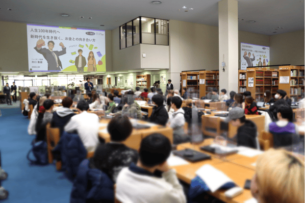 本授業は、同校春季講習の一環として開催され、高校3年生約390名のうち希望者約120名が参加いたしました。18万冊以上の蔵書を有し学校図書館として国内最大級の規模を誇る同校図書館で実施。テーマを「人生100年時代へ 新時代を生き抜く、お金との向き合い方」と設定し、講師はトレイダーズ証券取締役(外国為替ディーラー)の井口喜雄が務め、実務最前線で培った豊富な知見に基づく実践的な講義を展開いたしました。