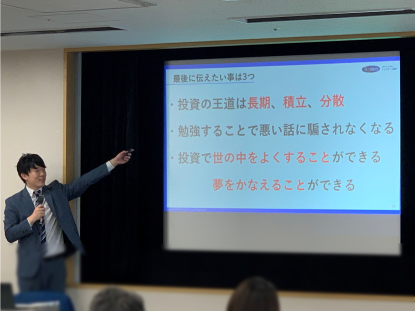 講義では、人生100年時代における収支管理の重要性と投資詐欺への注意喚起から始まり、為替変動のメカニズムや金利の影響、中央銀行の役割など、経済を読み解くための基礎知識を解説。複利の力や「長期・積立・分散」という投資の基本原則、企業の資金調達の仕組み、NISA制度にも触れ、参加者が自身のライフプランと結びつけて考えられる内容としました。
